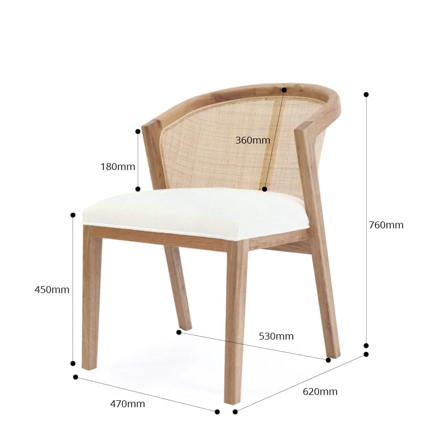 The Anka Oak Dining Chair is hand crafted from solid Oak with a rattan backing and cushioned seat, which now also comes in a white Warwick leatherette fabric for an easy clean. This chair will turn heads with its one of a kind design, a whimsical statement piece perfect for the home or office.