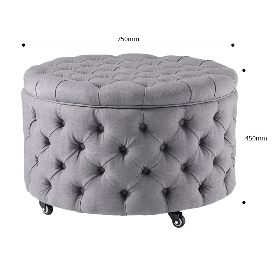 The Emma Storage Ottoman Large is perfect for a living room centerpiece and has inner storage space ideal for blankets, seasonal clothing, and accessories. A truly stunning round ottoman, finished in a heavy duty linen blend fabric.