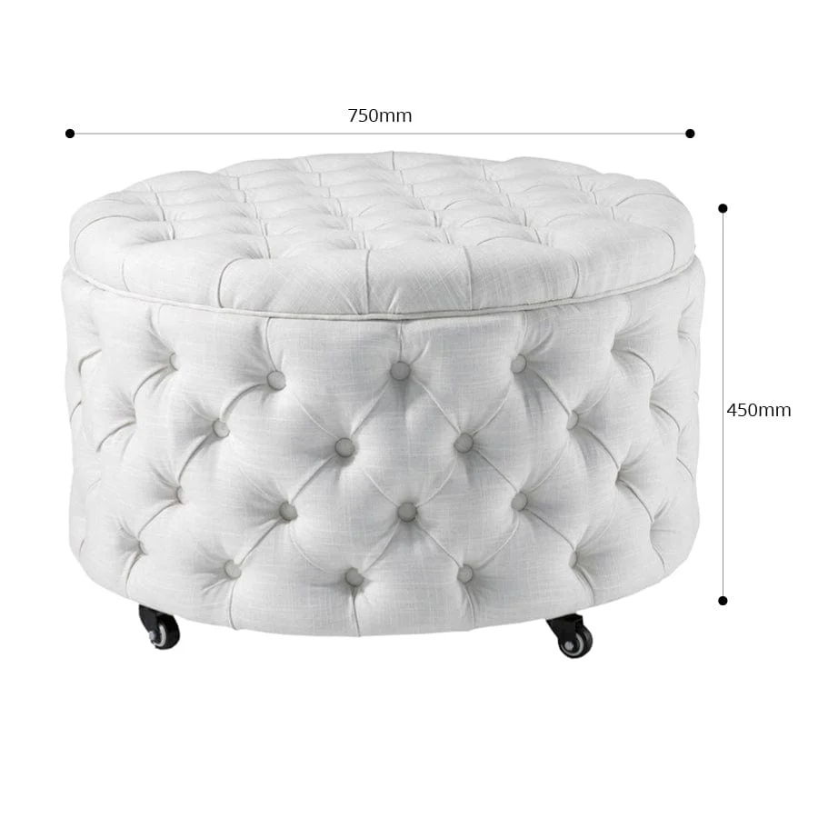 The Emma Storage Ottoman Large is perfect for a living room centerpiece and has inner storage space ideal for blankets, seasonal clothing, and accessories. A truly stunning round ottoman, finished in a heavy duty linen blend fabric.