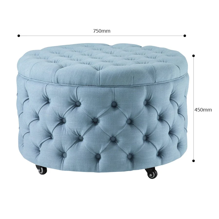 The Emma Storage Ottoman Large is perfect for a living room centerpiece and has inner storage space ideal for blankets, seasonal clothing, and accessories. A truly stunning round ottoman, finished in a heavy duty linen blend fabric.