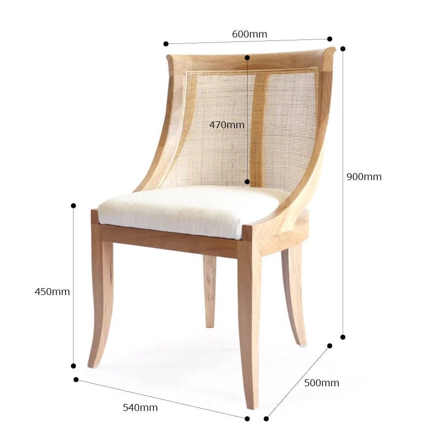 Experience the luxury of the Madrid Dining Chair, featuring solid Oak construction, a rattan backing, and a cushioned seat upholstered in high quality heavy duty linen blend fabric in Linen White. Add a touch of tradition to your home or office with this stunning statement piece.